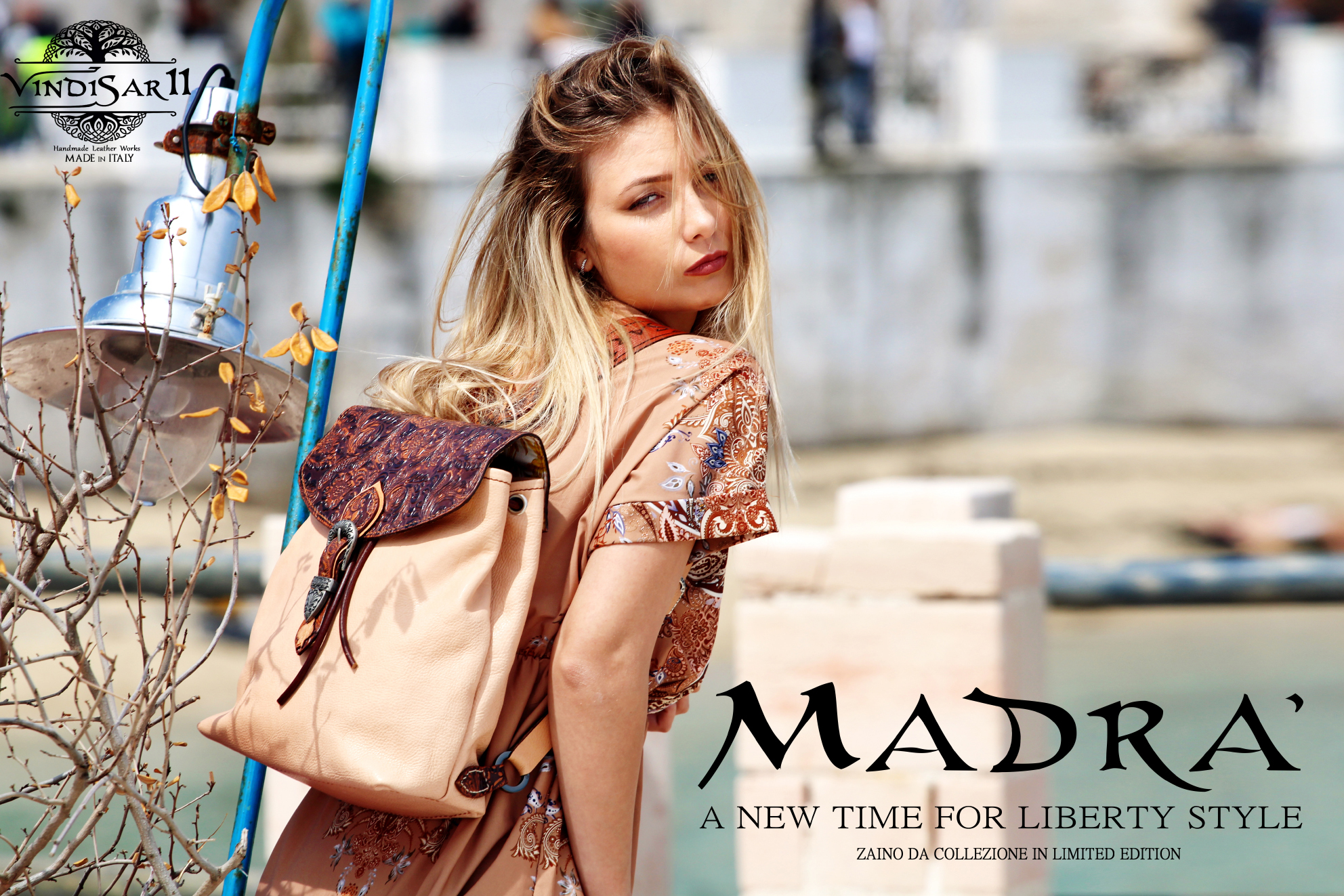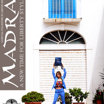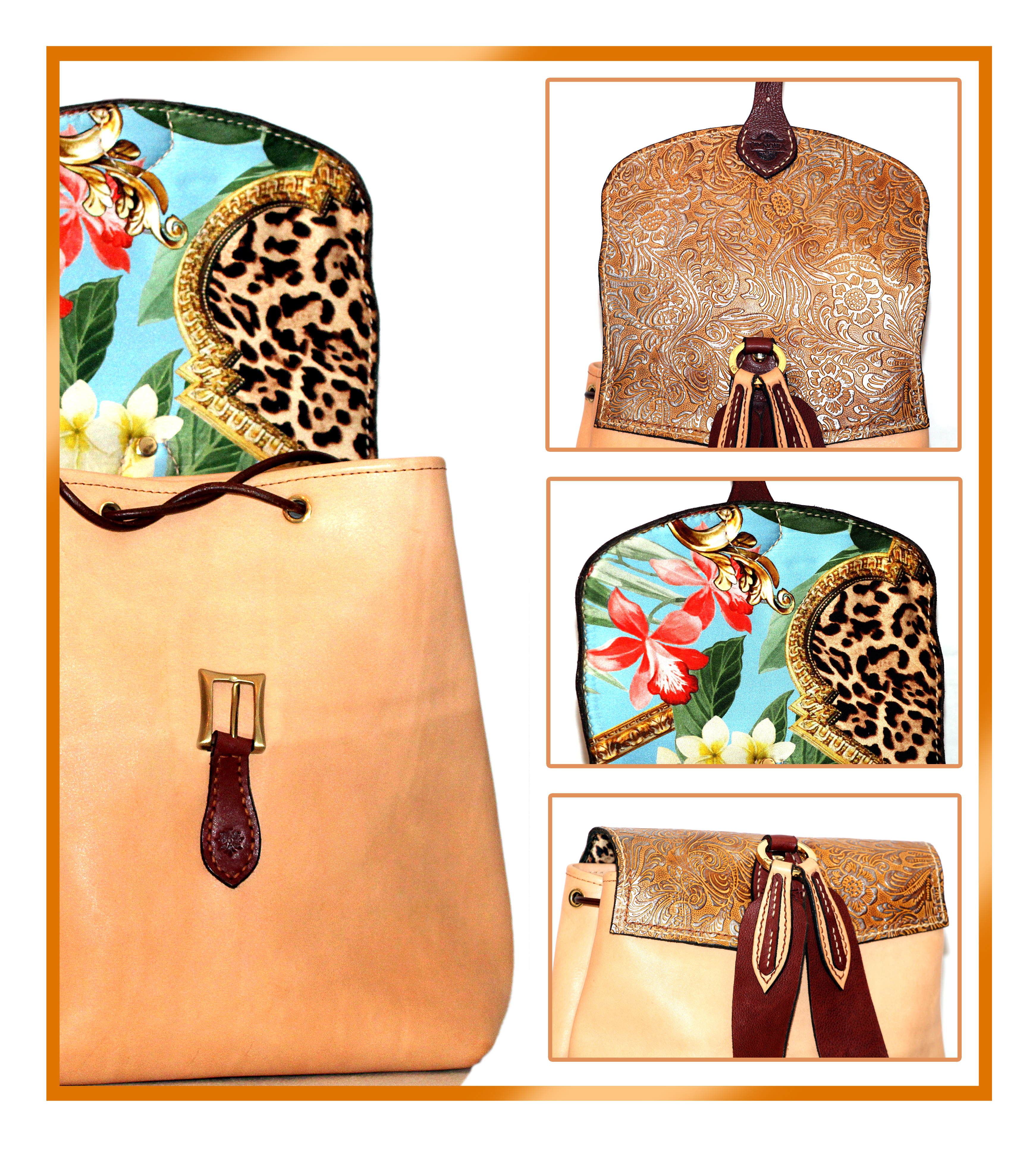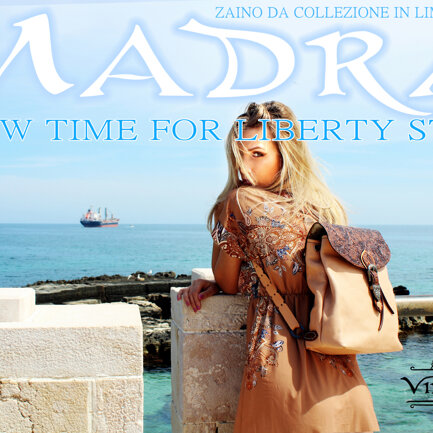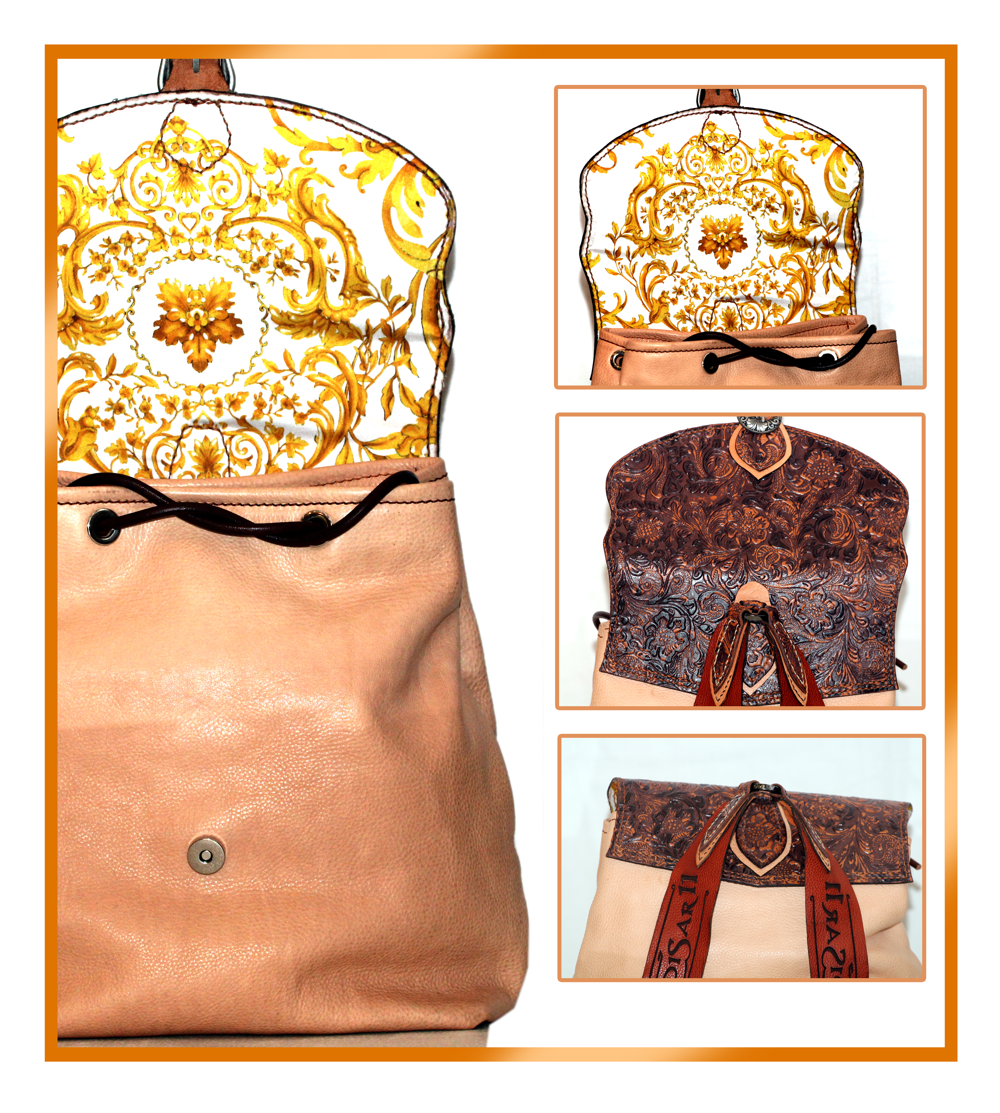 Sportello pressato in flower oro ed argento. Il sacco color naturale. Pelle morbida e liscia. Gli abbinamenti con il marrone sono unici. Resistente e durevole come ogni zaino Madra'.