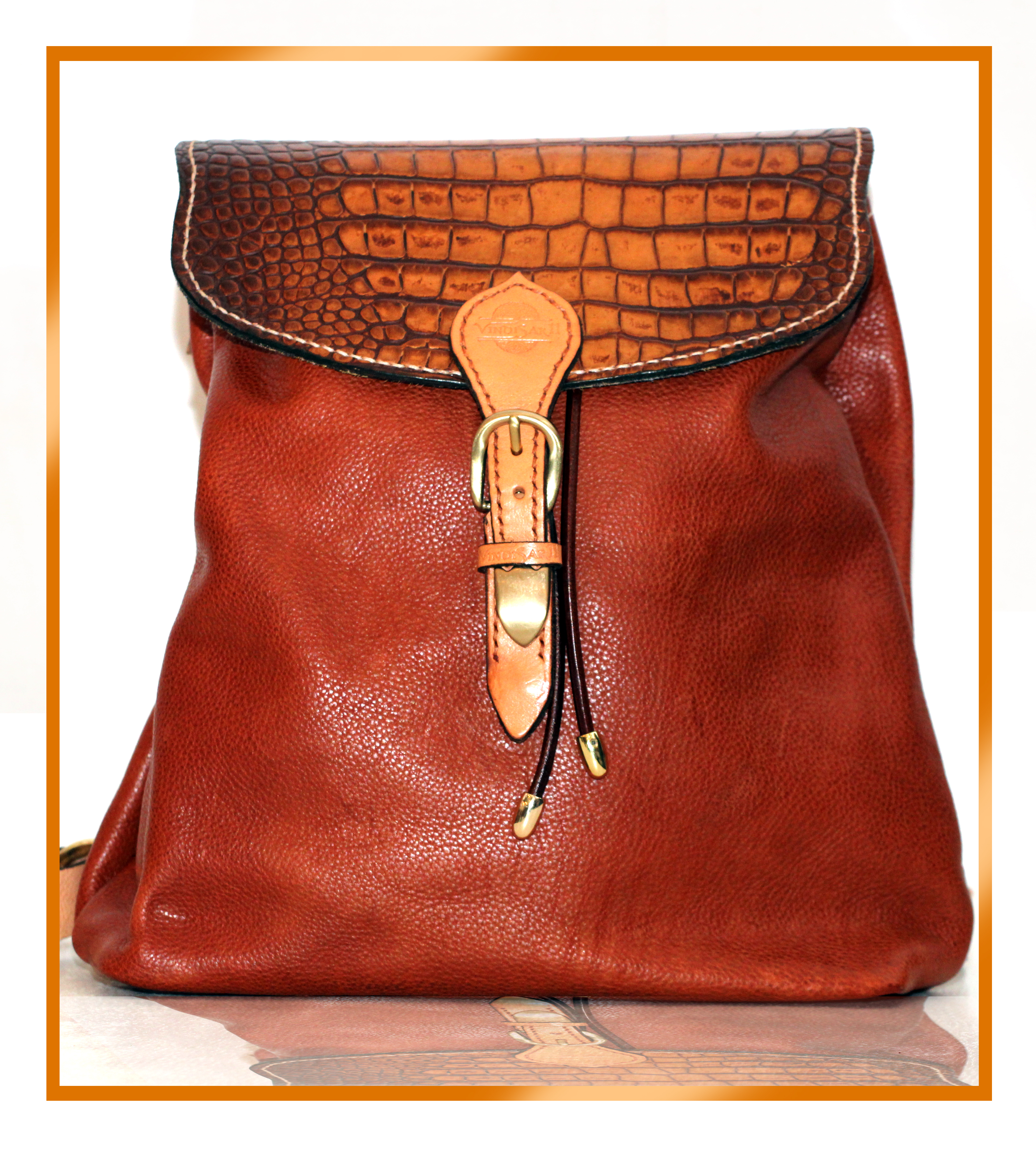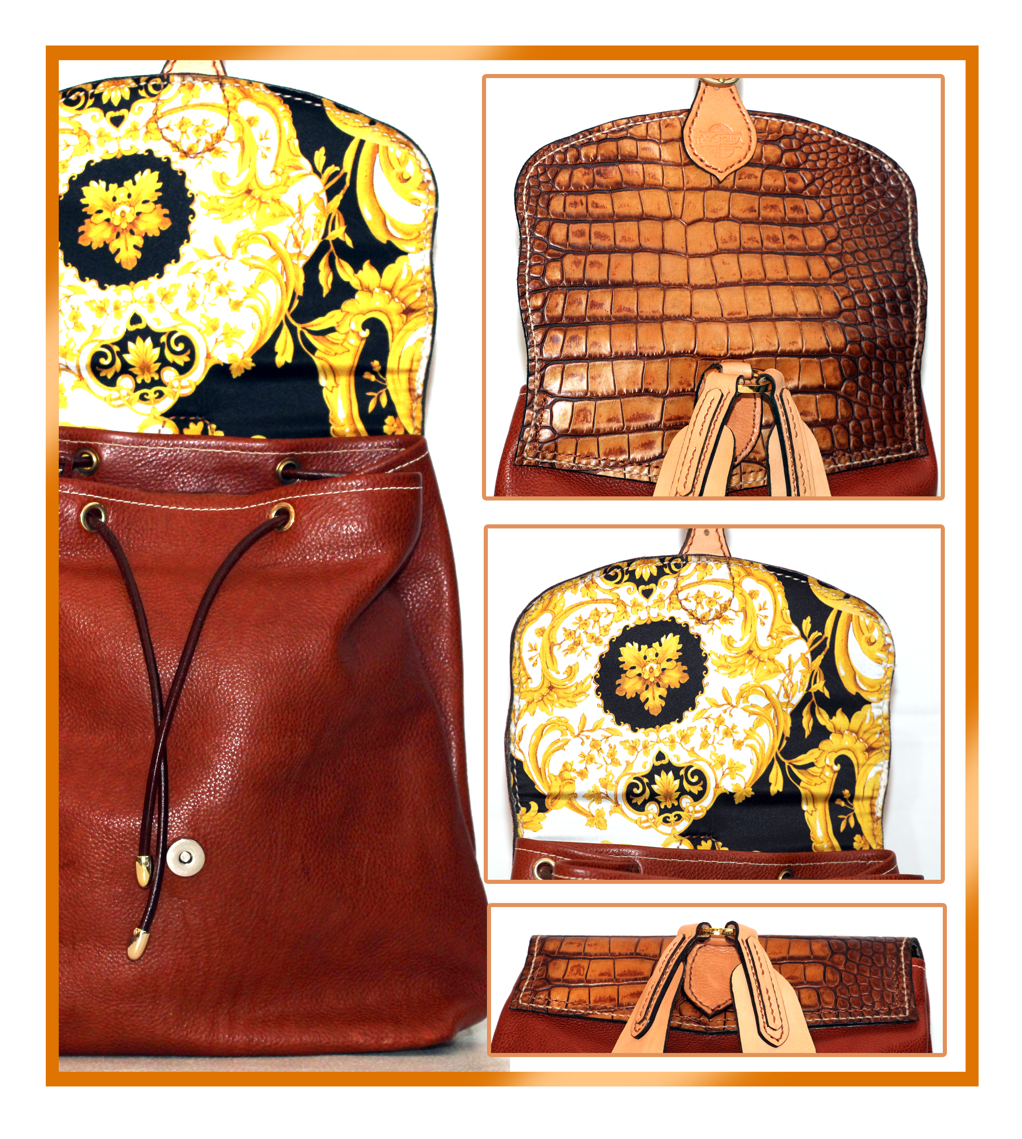 Sportello pressato in coccodrillo marrone e oro . Sacco marrone. Pelle morbida e liscia. Gli abbinamenti con il marrone sono indiscutibili. Resistente e durevole come ogni zaino Madra'.