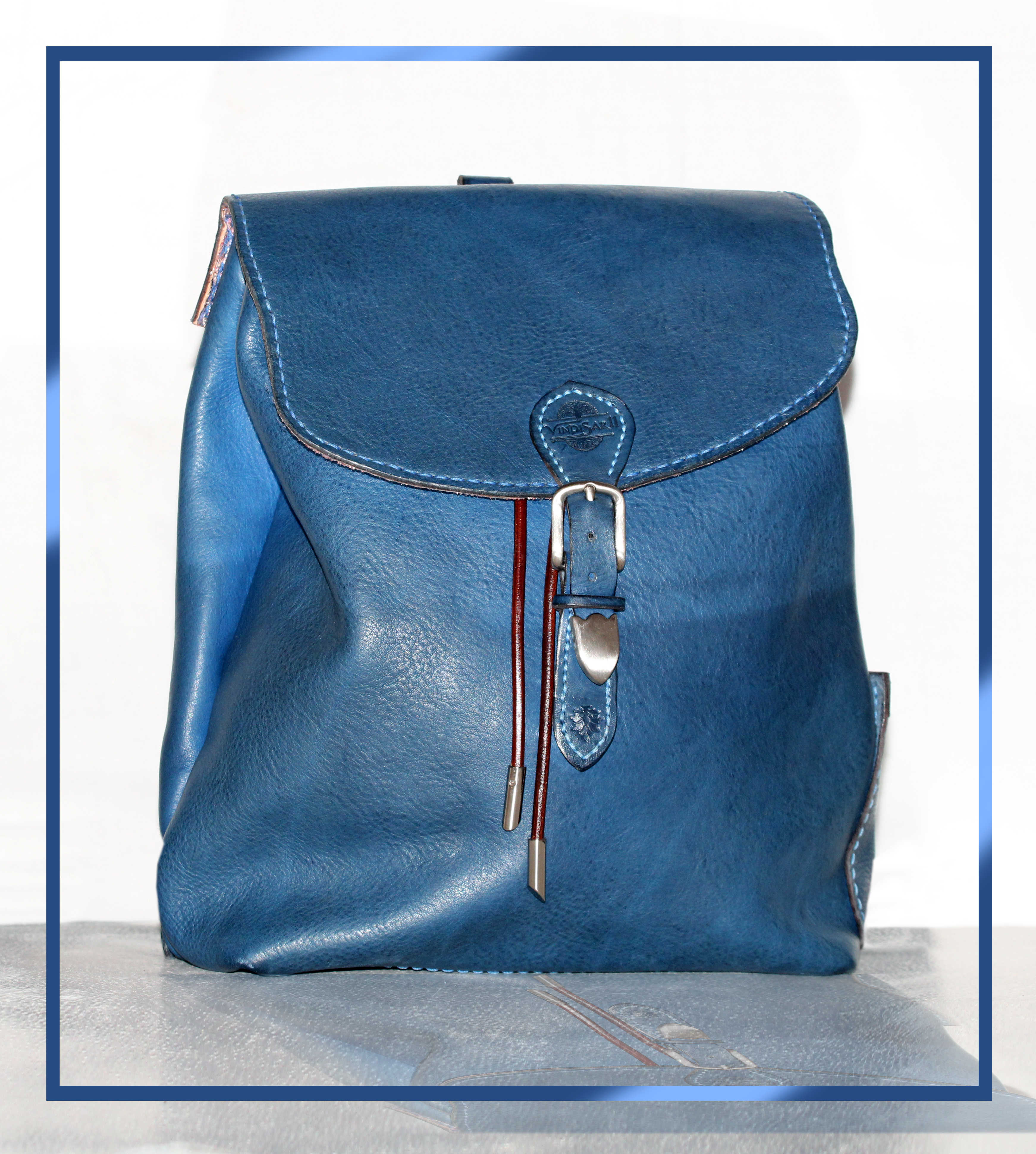 Sportello e sacco in tinta blue cobalto. Pelle morbida e volanata. Colore intenso e piacevole. Resistente e durevole come ogni zaino Madra'.